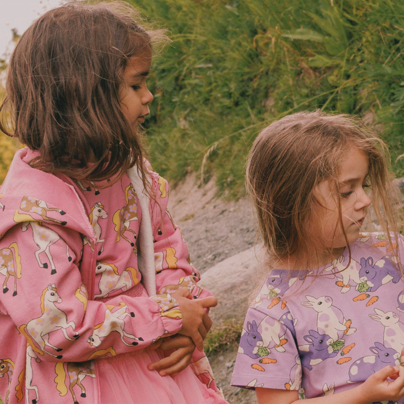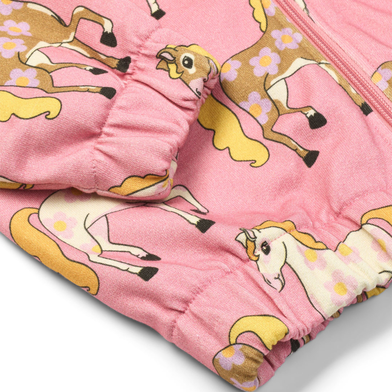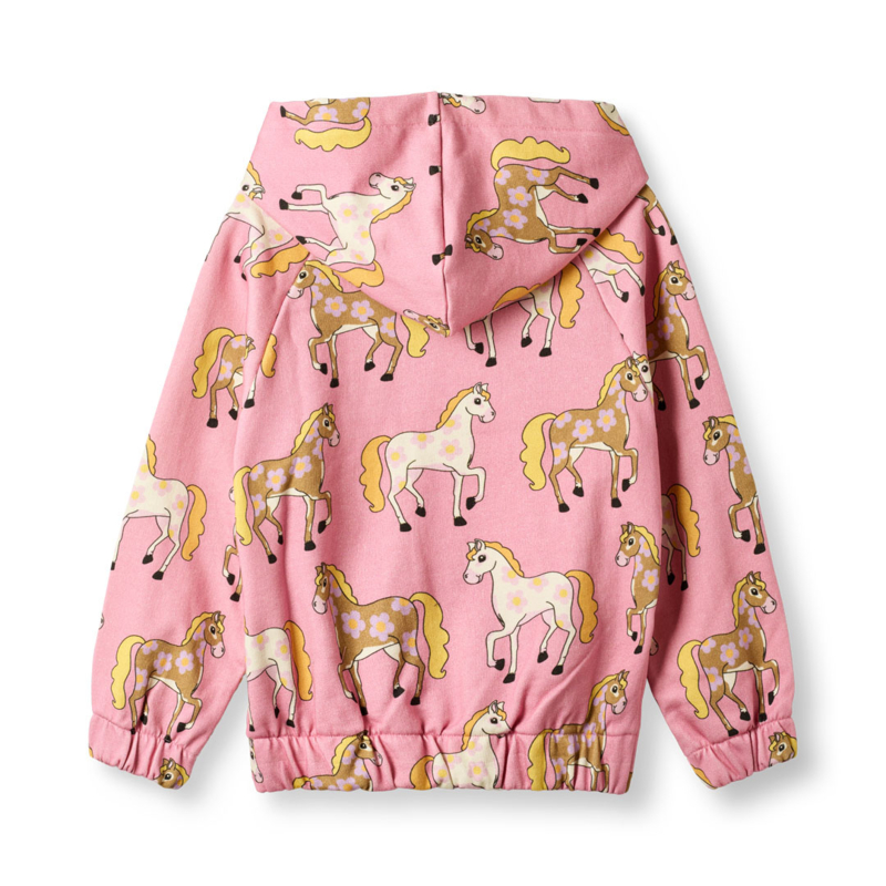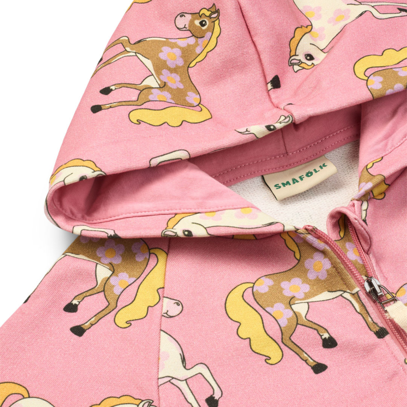 Prachtige paarden hoodie/ capuchonvest van Småfolk! Op een mooie zacht roze ondergrond is er een all-over print van paarden. De paarden zien er heel lief uit en hebben gekleurde manen en staarten en mooie bloemenprints op hun vacht. Het vest heeft een stevige roze rits en de capuchon is gevoerd. Kinbescherming, elastiek bij de boorden en aan de onderzijde van het vest.