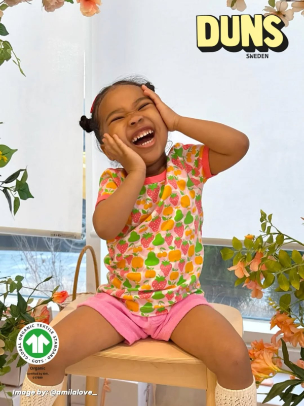 Een t-shirt met een frisse en fruitige print van het Zweedse Duns. Dit t-shirt heeft een all-over print van aardbeitjes, peertjes, kersjes en sinaasappeltjes op een wit met roze ondergrond. De kleuren zijn heel sprekend met groene peertjes, roze aardbeitjes en oranje sinaasappeltjes en kersjes.