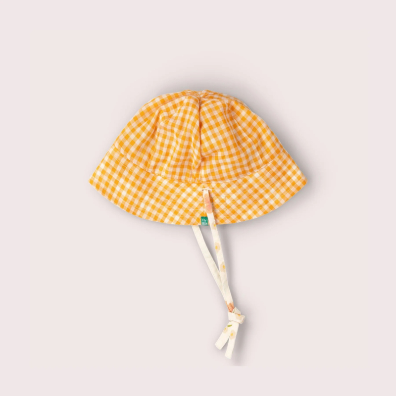 De zonnehoed is gemaakt van dubbeldoek katoen. Dubbeldoek katoen, ook wel double gauze genoemd, bestaat uit twee lagen dunne stof die met elkaar verbonden zijn. Hierdoor is het zacht, luchtig en comfortabel.